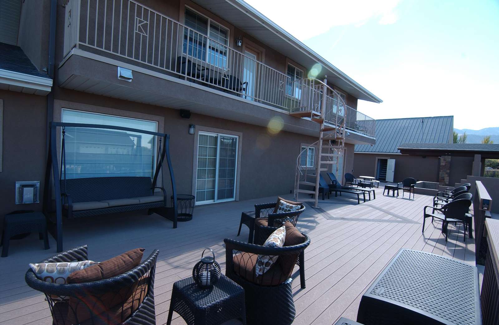 This large room with queen sized bed features balcony access with spiral stairway to the rear deck and BBQ courtyard area. The bonus room is available when booking 3 or more guests and has 2 double beds and 3 single beds.